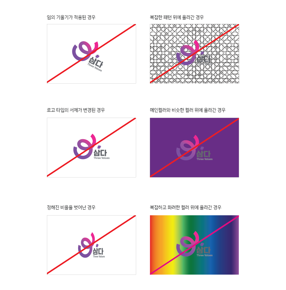 제시된 컬러의 수치를 정확히 사용함으로써 "삼다"의 아이덴티티가 훼손되지 않도록 한다